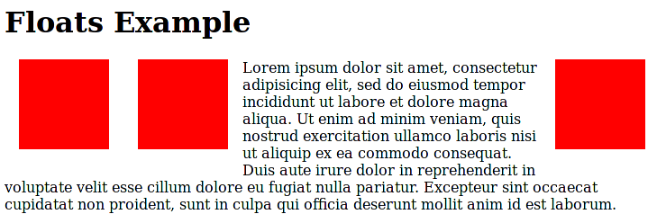 No exemplo abaixo, os elementos flutuantes são menores verticalmente que o bloco de texto com os quais estão flutuando. Apesar disso, se o texto não fosse comprido o bastante para passar abaixo do limite inferior de todos os floats, nos veríamos efeitos não previstos. Se o parágrafo abaixo, por enquanto, somente lê "Lorem ipsum dolor sit amet,", e fosse seguido por outro cabeçalho do mesmo estilo de cabeçaljo "Floats Example", o segundo cabeçalho iria aparecer entre os dois boxes vermelhos. Muito provavelmente, queremos que o próximo título seja alinhado à esquerda. Para conseguir isso, precisamos limpar os floats.